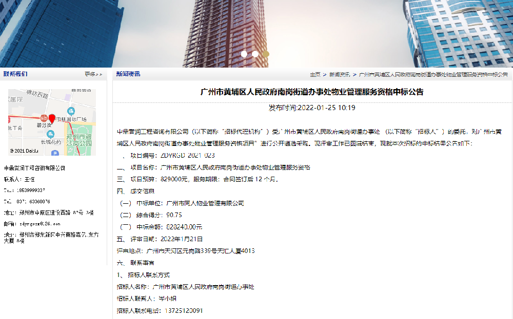 鼎點(diǎn)娛樂工程咨詢有限公司(以下簡稱“招標(biāo)代理機(jī)構(gòu)”)受廣州市黃埔區(qū)人民政府南崗街道辦事處 (以下簡稱“招標(biāo)人”)的委托,對(duì)廣州市黃埔區(qū)人民政府南崗街道辦事處物業(yè)管理服務(wù)資格項(xiàng)目”進(jìn)行公開遴選采購。現(xiàn)評(píng)審工作已圓滿結(jié)束,現(xiàn)就本次招標(biāo)的中標(biāo)結(jié)果公告如下:一、項(xiàng)目編號(hào):ZDYRGD-2021-023二、項(xiàng)目名[詳細(xì)]